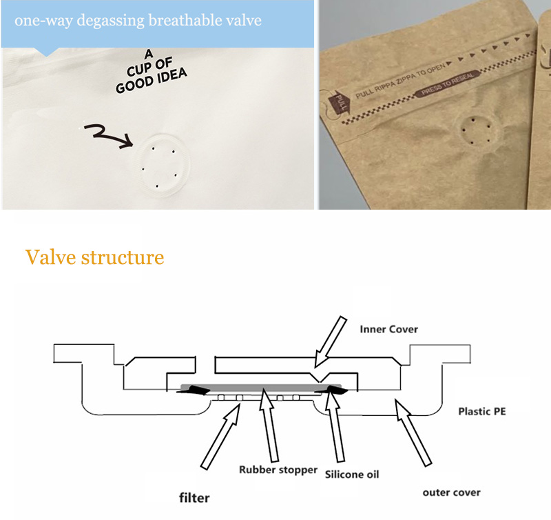 Односторонний дышащий клапан может эффективно удалять углекислый газ, выделяемый кофейными зернами и кофейным порошком, предотвращая попадание кислорода в упаковочный пакет и сохраняя свежесть кофейных зерен и порошка. Кофейные пакеты с клапаном могут эффективно поддерживать аромат и вкус, улучшая качество кофе.