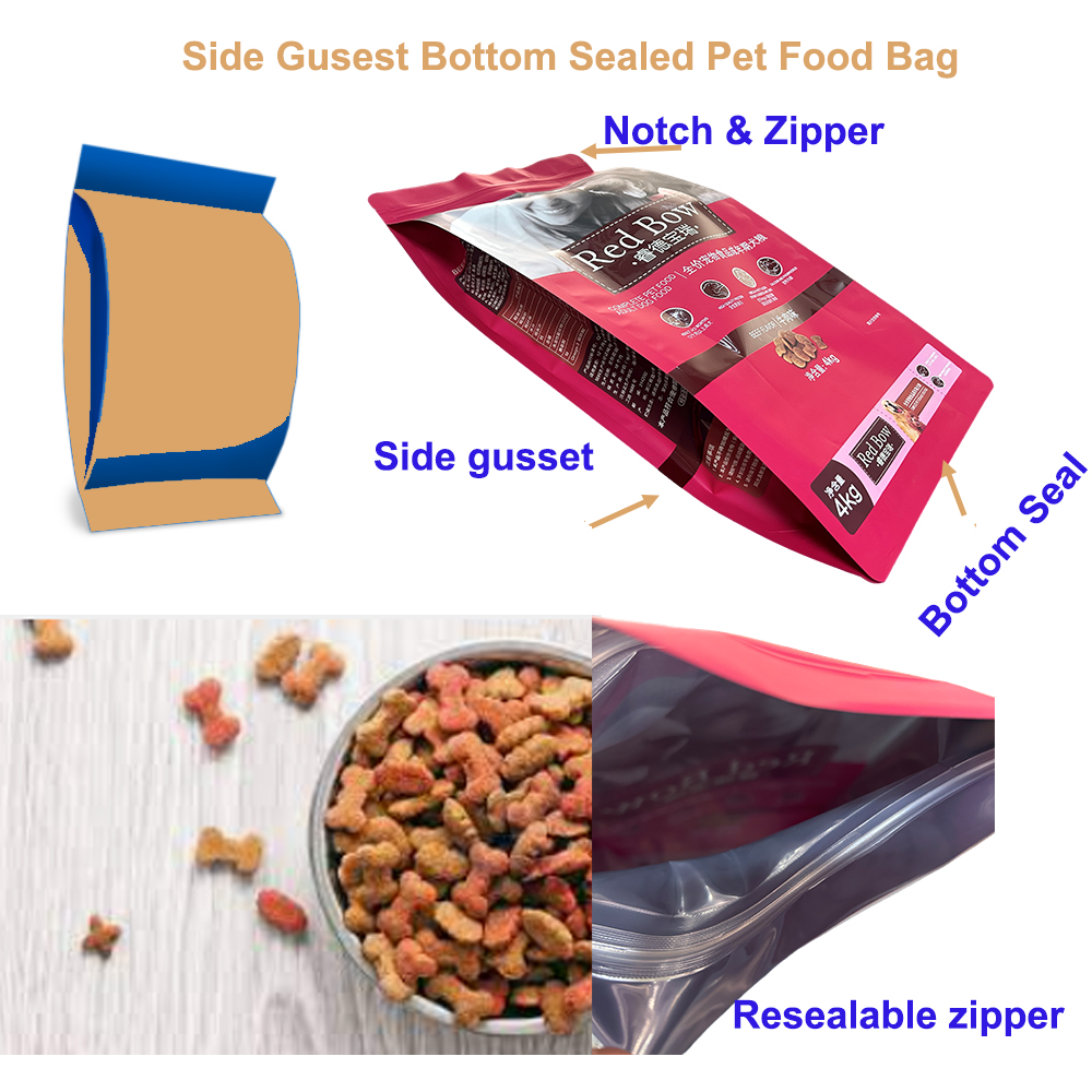 Сумки с боковыми складками популярны не только для корма для животных, но и являются популярным выбором для упаковки снеков, сухих ингредиентов и даже замороженных продуктов.